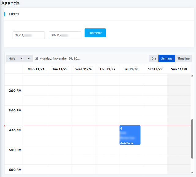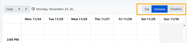 Por defeito, o calendário carrega a agenda da semana corrente.